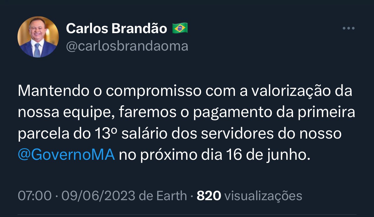 “Mantendo o compromisso com a valorização da nossa equipe, faremos o pagamento da primeira parcela do 13º salário dos servidores do nosso @GovernoMA no próximo dia 16 de junho”, afirmou Brandão nas redes sociais.