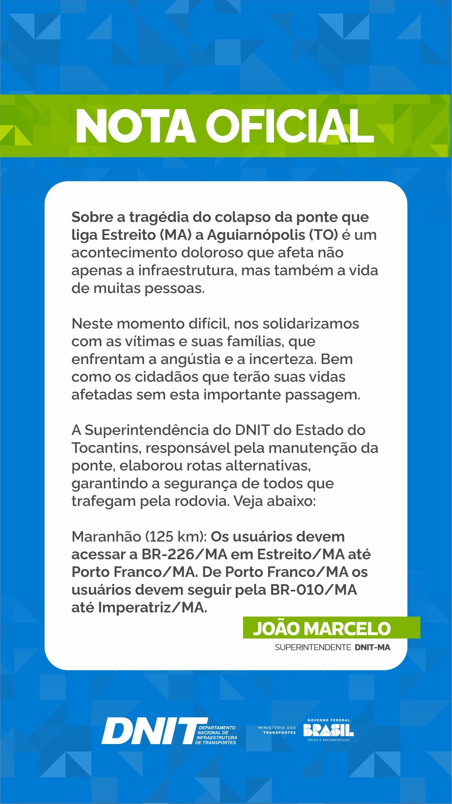 O DNIT do Maranhão informou por meio de nota assinada pelo superintendente João Marcelo, que a ponte Juscelino Kubistcheck que ligava as cidades de Aguiarnopolis e Estreito, e desabou neste domingo, 22, era de responsabilidade do DNIT do Tocantins.